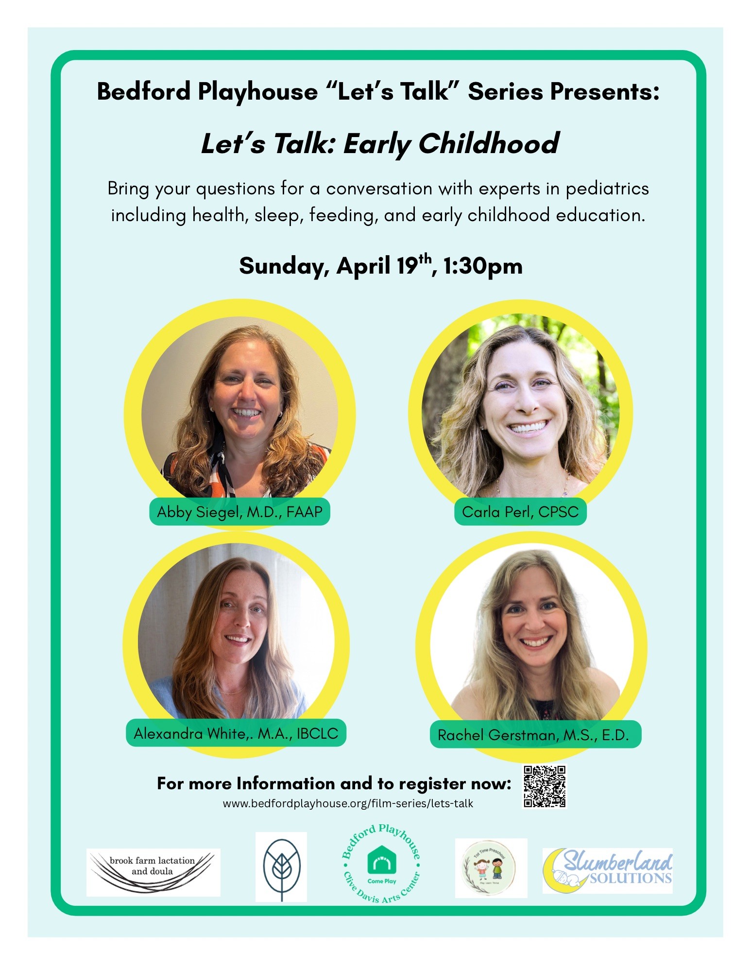 Join a panel of experts for an enlightening conversation covering everything from infancy to toddlerhood and beyond. Dr Abby Siegel, M.D., FAAP is a Board Certified Pediatrician who does home sick visits for children in Westchester and CT through her private practice, Abby Siegel Health Consulting. Rachel Gertsman, M.S., E.D. is the owner of Tot Time, a private Preschool located in North Salem. Carla Perl, CPSC is a Certified Pediatric Sleep and Positive Encouragement Consultant. Through her company, Slumberland Solutions, she creates customized sleep and toddler behavior plans tailored to each family’s unique needs. Alexandra White, M.A., IBCLC is an International Board-Certified Lactation Consultant (IBCLC) working in private practice and overseeing the Doula Program at Bedford Hills Correctional Facility.