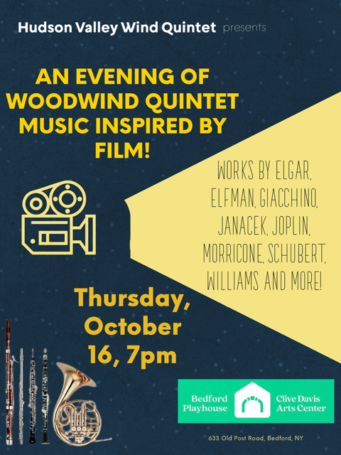Join the Hudson Valley Wind Quintet (flute, oboe, clarinet, bassoon, French horn) for an evening of music inspired by film! Featuring music from: